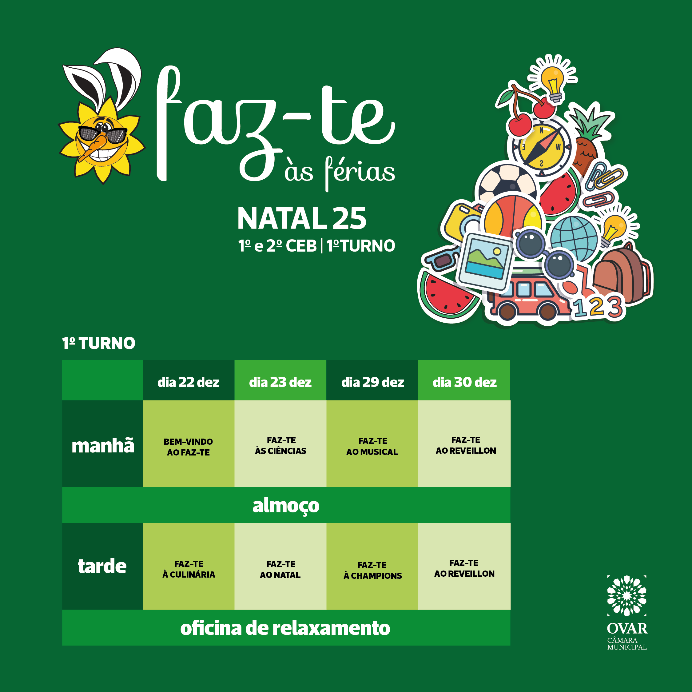 O Programa decorre nos dias 22, 23, 29 e 30 de dezembro (4 dias) e funcionará na EB António Dias Simões (Ovar) e na EB Praia (Esmoriz). Destinado a alunos do 1º e 2º CEB, o Faz-te às Férias Natal  integra um conjunto de iniciativas e atividades lúdico-pedagógicas, culturais, desportivas, científicas e artísticas, entre outras, que visam desenvolver o espírito de iniciativa, a capacidade crítica e os sentidos de solidariedade, responsabilidade e organização dos participantes.