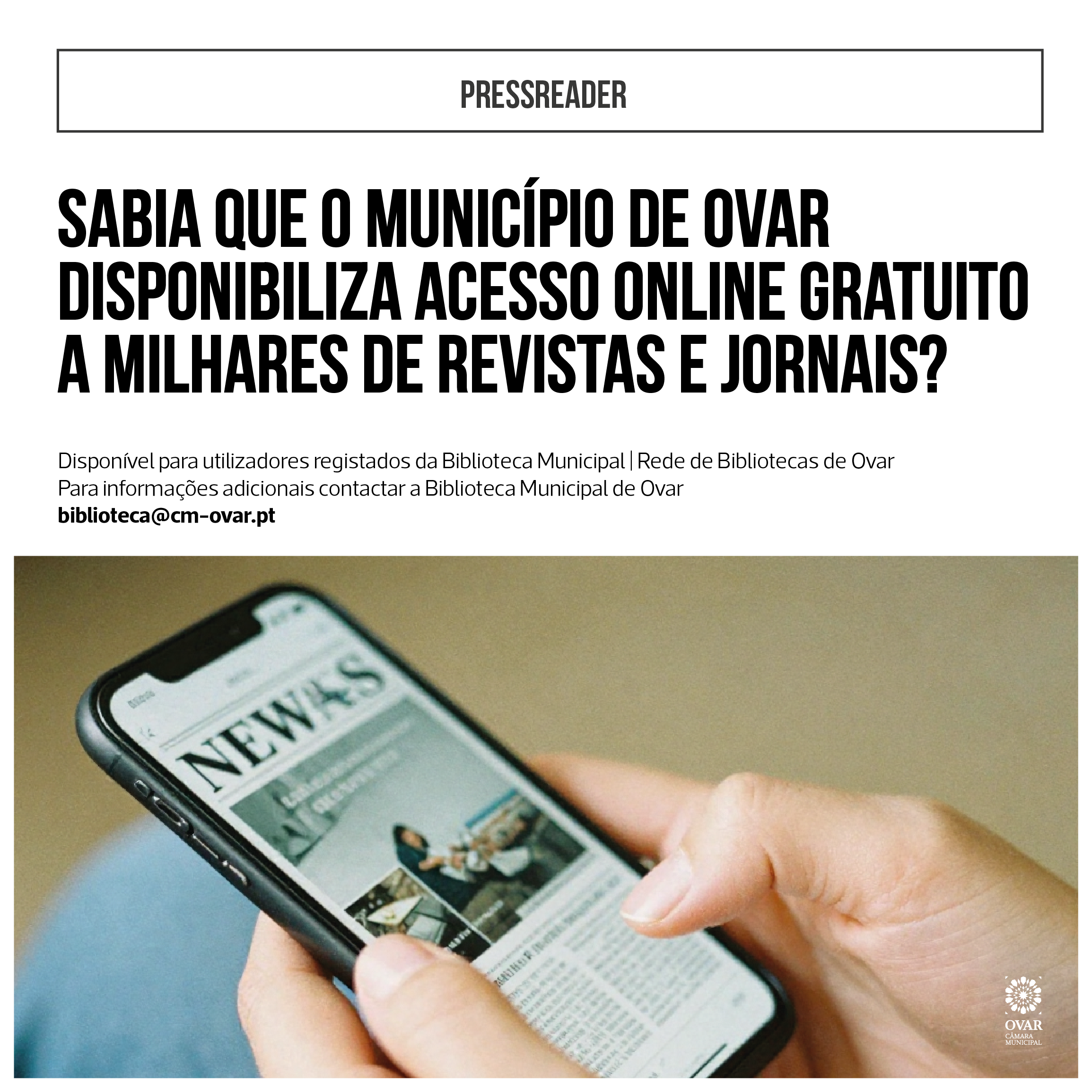 O Município de Ovar disponibiliza a todos os utilizadores registados da Biblioteca Municipal | Rede de Bibliotecas de Ovar, através da plataforma PressReader, o acesso gratuito a dezenas de revistas e jornais nacionais e internacionais. Com esta medida, a autarquia contribui para promover a literacia e o conhecimento de todos os munícipes.